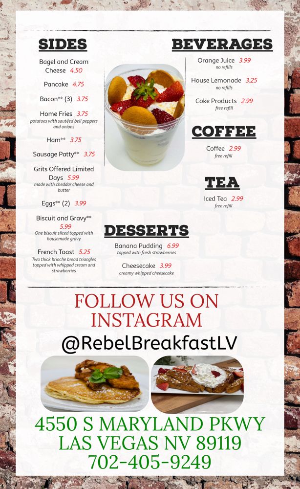 Welcome to Rebel Breakfast and Grill, a gem nestled in Las Vegas that redefines the breakfast and brunch experience. Situated at 4550 Maryland Pkwy, this American café boasts a delightful menu that caters to diverse tastes.